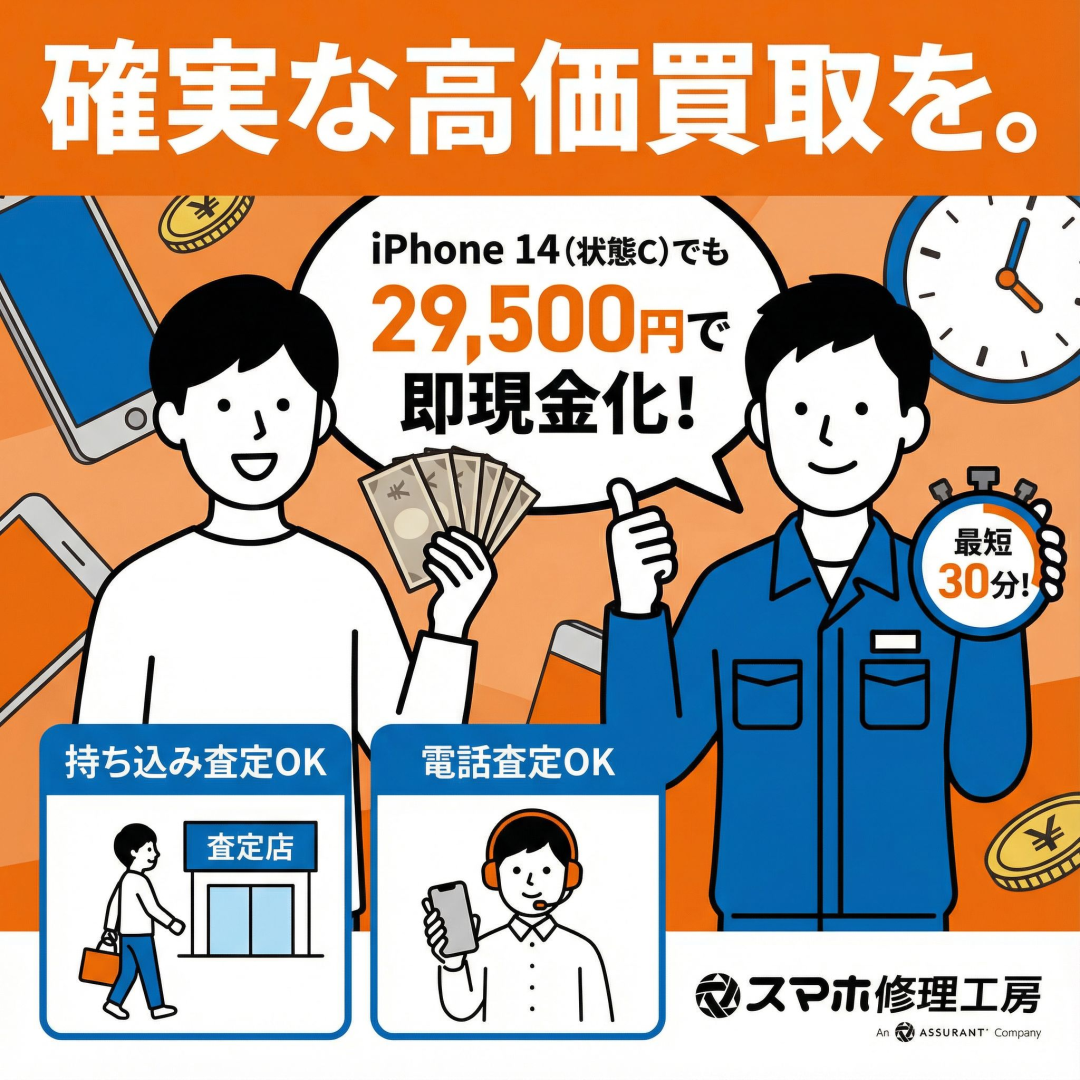 一か八かの勝負より、確実な高価買取を。iPhone 14(状態C)でも29,500円で即現金化!|モバトル イオンモール福岡店